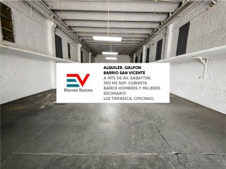 EXCELENTE GALPON ESTRATEGICAMENTE UBICADO EN BARRIO SAN VICENTE, A METROS DE AVENIDA SABATTINI, PROXIMO A CIRCUNVALACION Y AL CENTRO DE LA CIUDAD CARACTERISTICAS 350 M2 DE SUPERFICIE TOTAL CUBIERTA TECHO ASTORI LUZ TRIFASICA BAÑOS DE HOMBRES Y DE MUJERES ESCENARIO 3 OFICINAS, UNA AL INGRESO, DOS AL FONDO CONSULTE EV BIENES RAICES